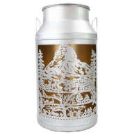 Ein einzigartiges Kunstwerk zum Aufhängen oder Aufstellen. Zwei Schweizer Traditionen wurden zusammengeführt: Die klassische Milchkanne; aus der Milchwirtschaft & das Handwerk des Scherenschnitts (von Esther Gerber). Daraus sind die speziellen Laternen in